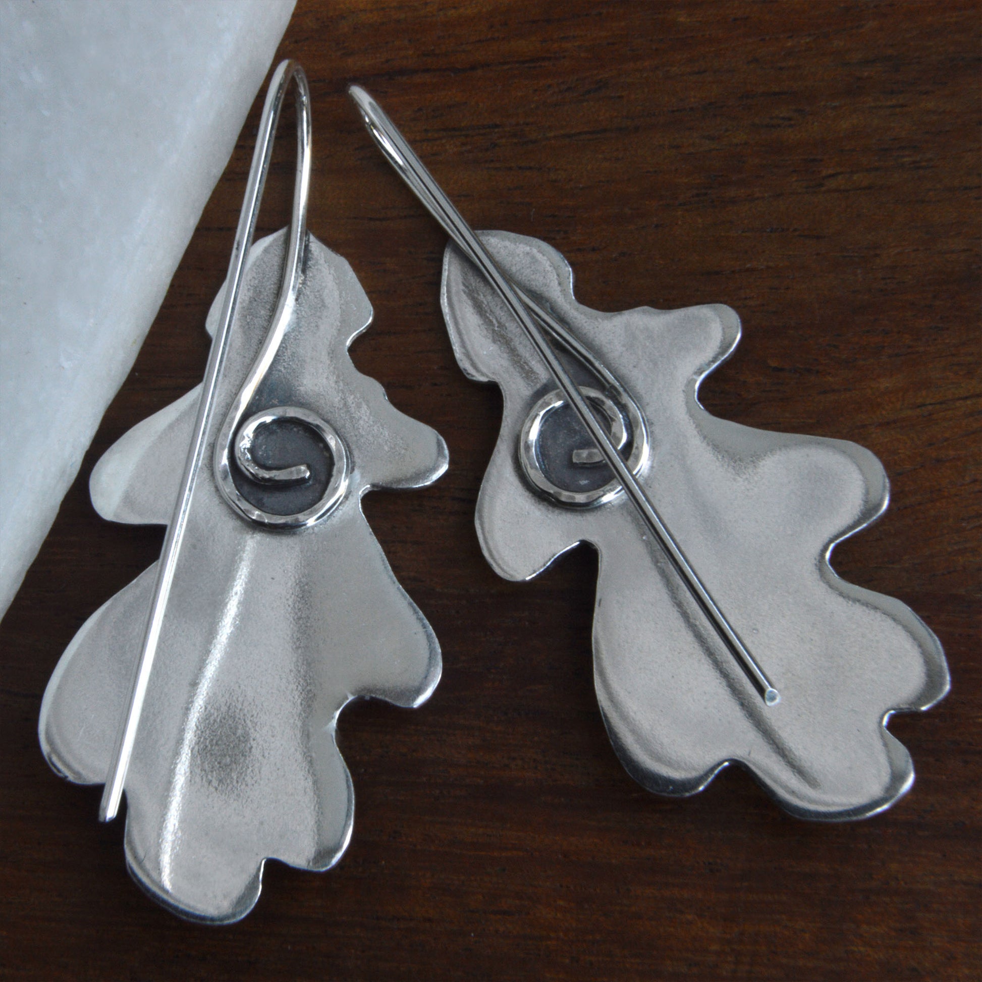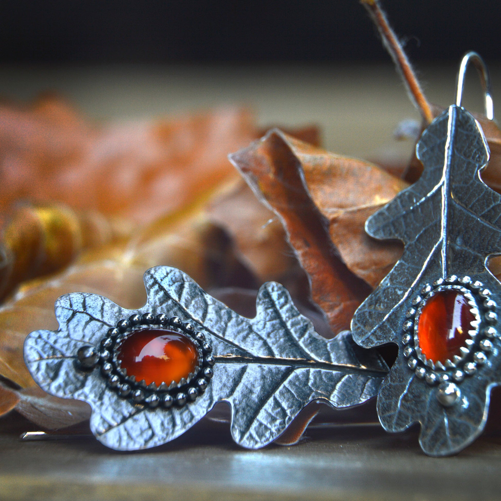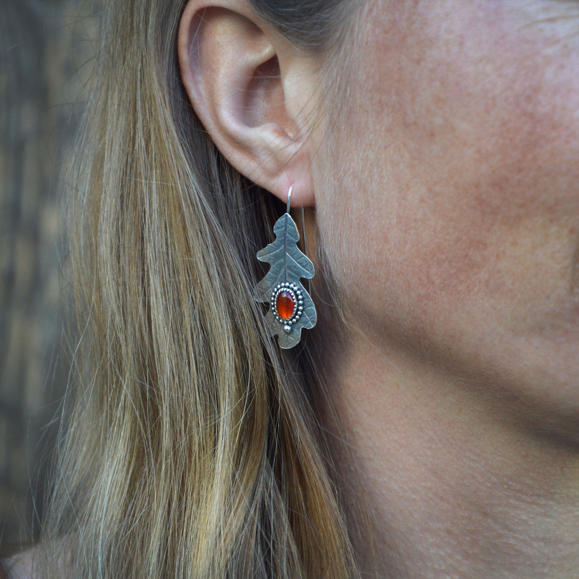 Elegant in their simplicity, these oxidized sterling silver oak leaves are super light weight and comfortable. In daylight you can make out the oxidized veins through the glowing carnelian cabochon.