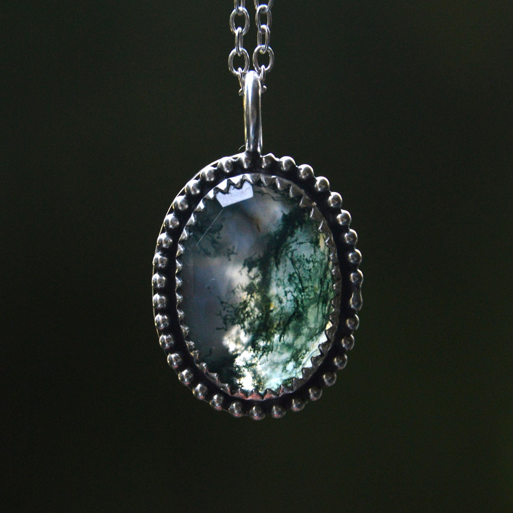 At the heart of this necklace is a stunning moss agate stone, known for its grounding properties. Its deep green and earthy tones remind me of the peaceful, moss-covered floors of ancient forests.